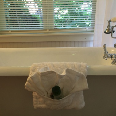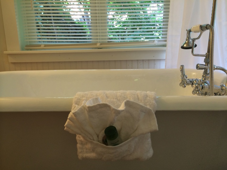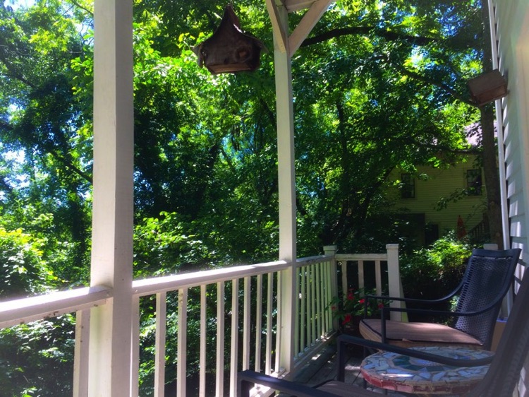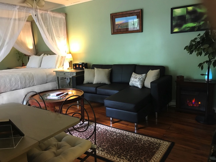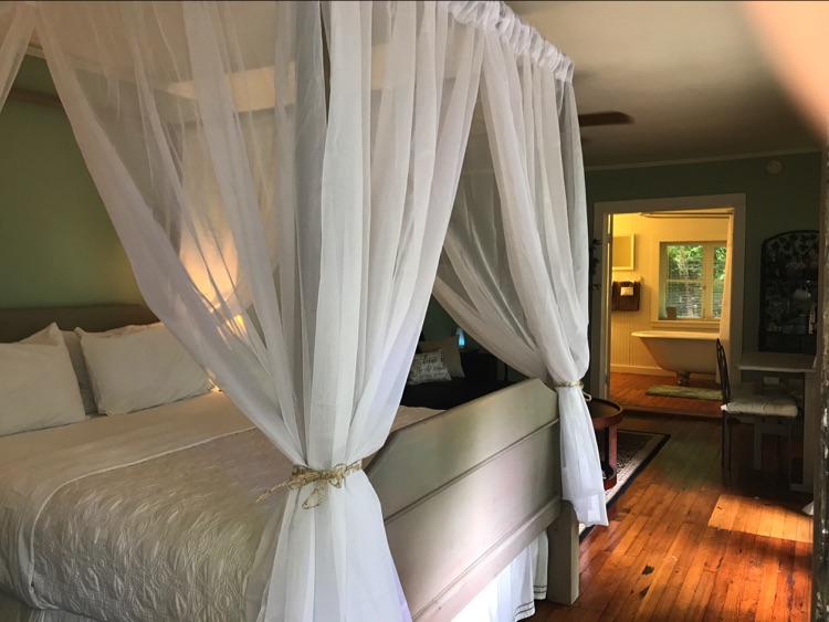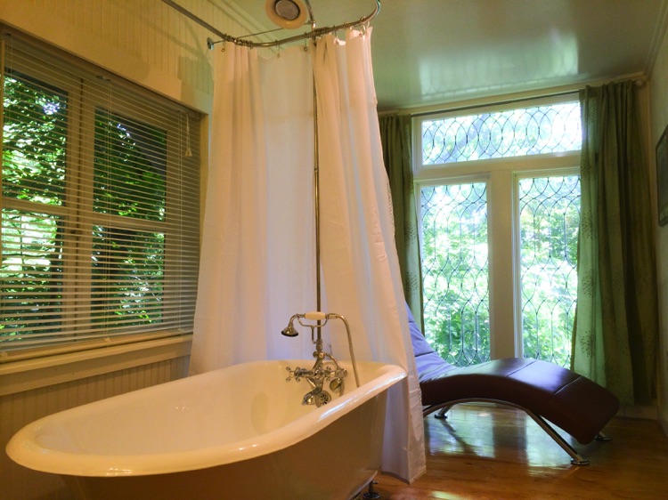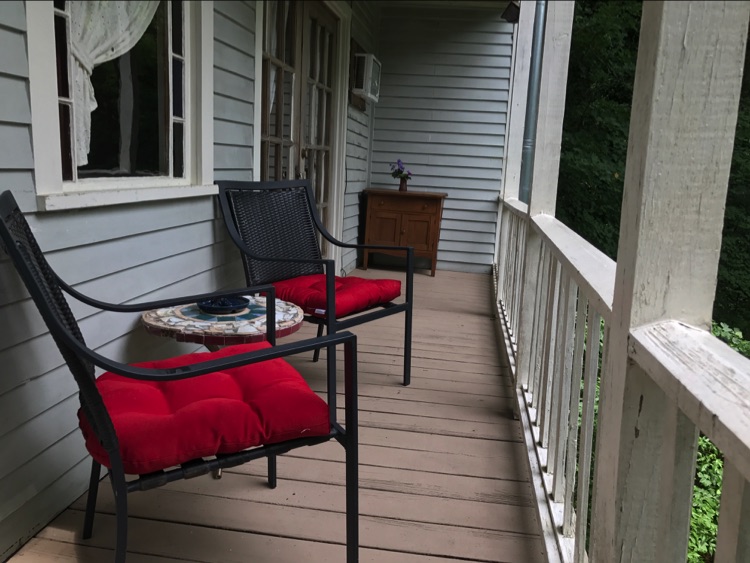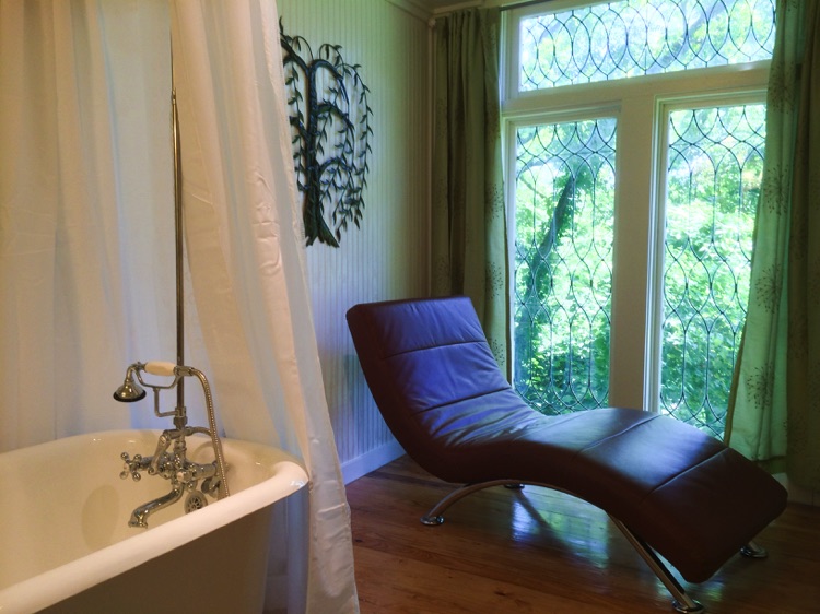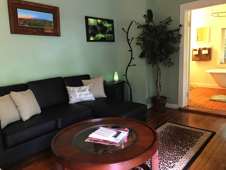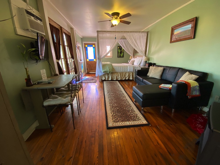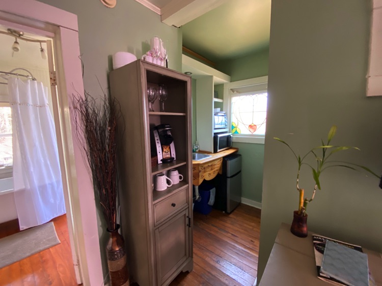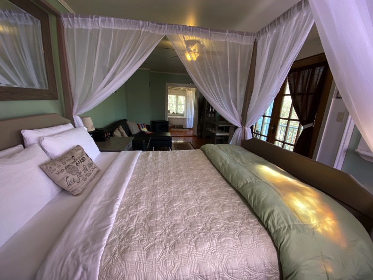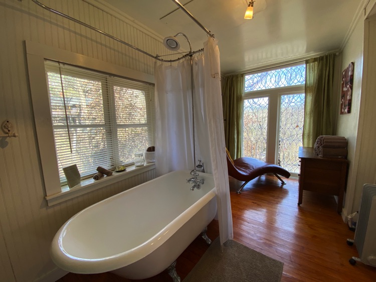 Quaint zen hideaway on lower level. Featuring main room with queen canopy bed and sitting area with rench doors that open to a private back porch with views of Eureka’s in-town woods, mountains and the Christ of the Ozarks statue. Large, bright, airy bathroom features a relaxation lounge and clawfoot tub with shower. Kitchenette includes a refrigerator, microwave, keurig and toaster oven.